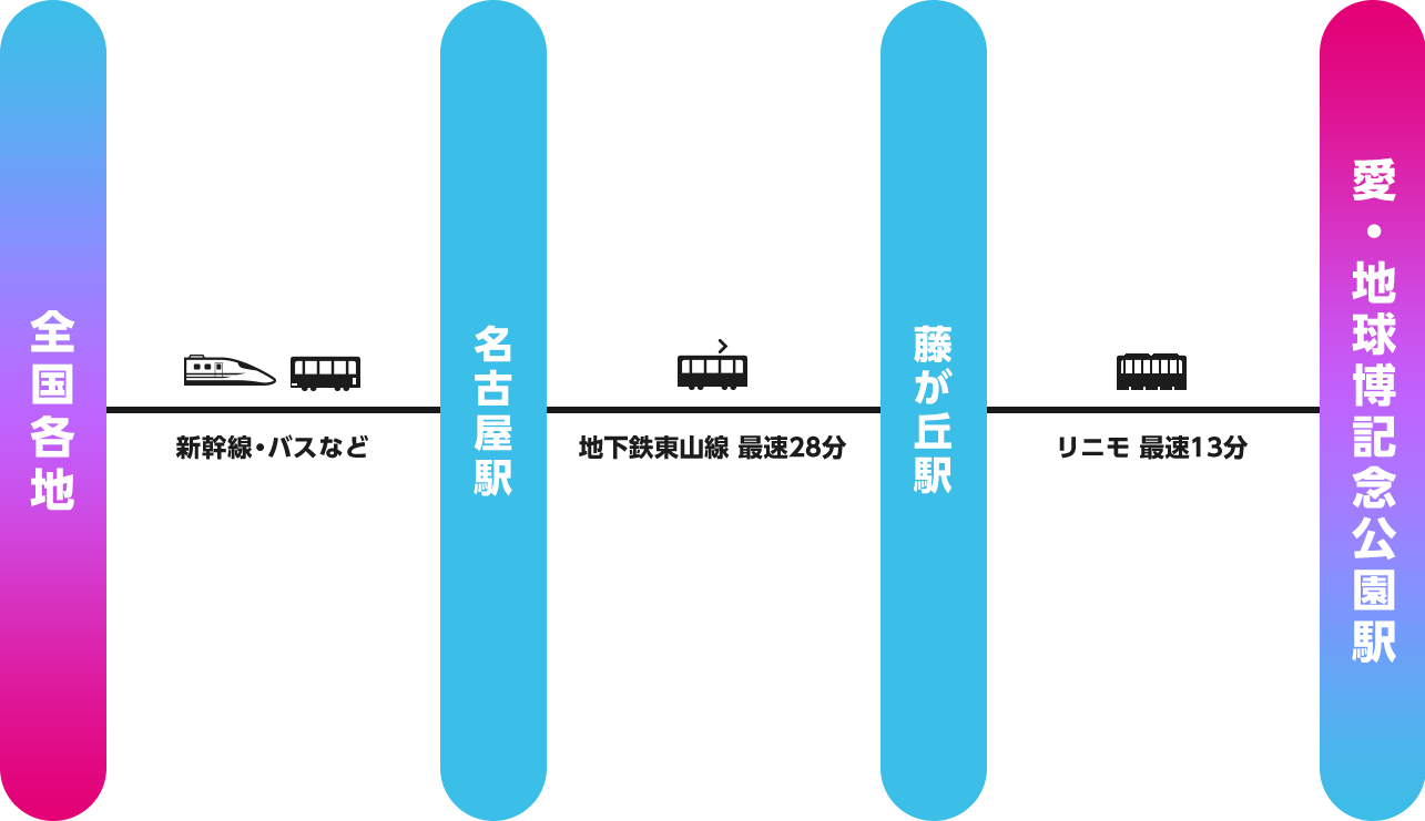 ※モリコロパーク(愛・地球博記念公園)は、お車でお越しいただいても駐車できないばかりか周辺地域での大渋滞が予測されますので、全ての皆様に公共交通機関でのご来場をお願いいたします。